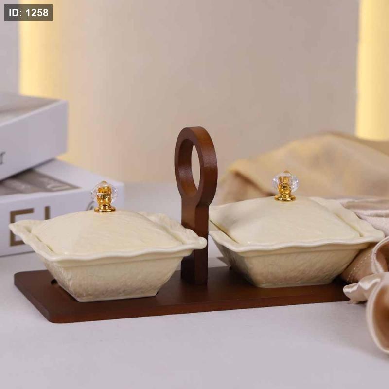 طقم مضايف /2 بورسلان بيج مربع بغطاء قاعدة خشب