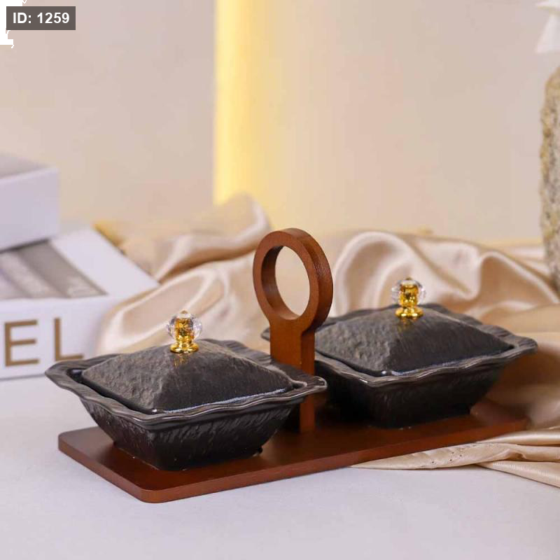 طقم مضايف /2 بورسلان اسود مربع بغطاء قاعدة خشب