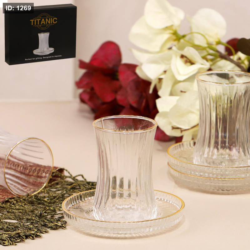 طقم كاسات شاي 6+6 استكانة زجاج محزز حز ذهبي HY-20134